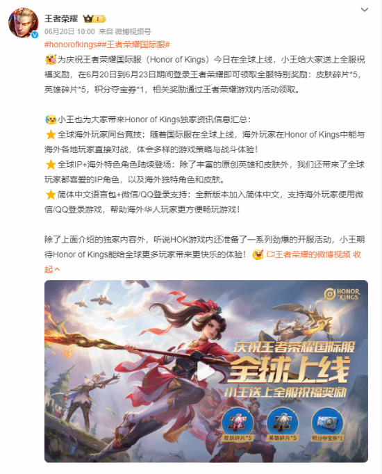《王者荣耀》国际服(Honor of Kings)现已全球上线,在6.20-6.23期间登录王者荣耀即可领取全服特别奖励:皮肤碎片*5,英雄碎片*5,积分夺宝券*1。