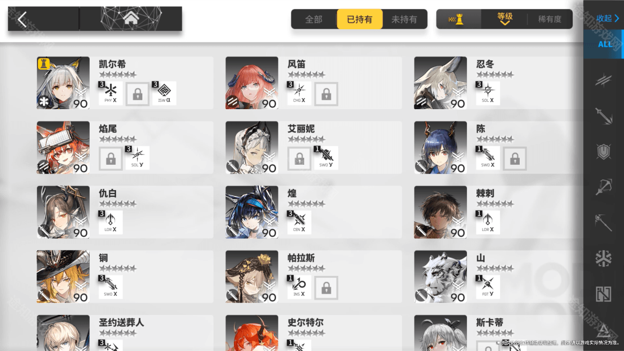 可以通过点击上方按钮对展示干员进行筛选及排序,也可以根据干员职业、子职业对展示干员进行筛选。