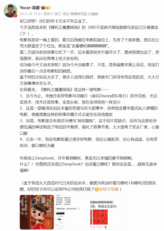 此前我们曾报道过,《黑神话:悟空》的制作人冯骥今日发文,谈到了今年的春节档电影《哪吒之魔童闹海》,称其为迄今为止,中国合家欢电影与动画片(类似Disney的G级片)的天花板,无论是美术、技术还是故事,全是长板,放在全球依然一样顶尖。
