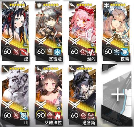 煌(精二60级)、山(精二60级)、塞雷娅(精二60级)、艾雅法拉(精二90级)、澄闪(精二60级)、逻各斯(精二60级)、夜莺(精二60级)