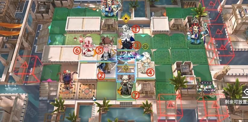 如图所示,开场依次部署山、逻各斯(朝左)、煌(朝上)、夜莺(朝上)、艾雅法拉(朝右)、澄闪(朝右)、塞雷娅