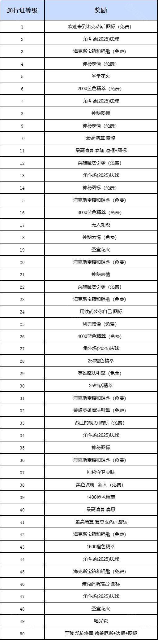 提升通行证里程碑可获得的免费奖励为:9000蓝色精萃、3个英雄魔法引擎、1个荣耀英雄魔法引擎、3个神秘表情、1个神秘图标、欢迎来到诺克萨斯 图标、战士的魄力 图标、利刃威慑 表情、黑色玫瑰 新人 头衔、8个海克斯科技宝箱和钥匙。