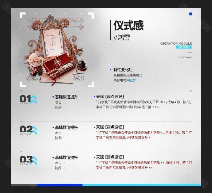 打字机的攻击使命中目标的防御力进一步下降,打字机放在鸿雪周围8格则效果提升
