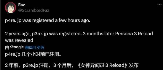 作为参考,两年前Atlus先是注册了p3re.jp的域名。三个月后,《女神异闻录3 Reload》正式公开。