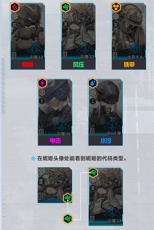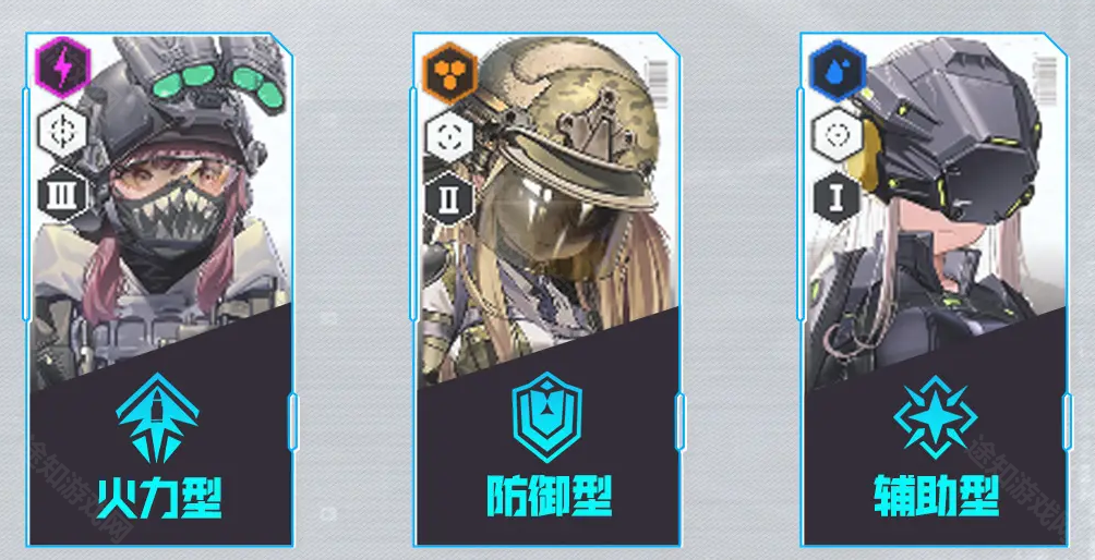 妮姬分为火力型、防御型、辅助型,只能穿着对应类型的装备。