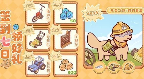 完成7日签到即可免费领取限定家具*4、全新狗狗套装「乐劳悠然」及蜗壳币*50等奖励