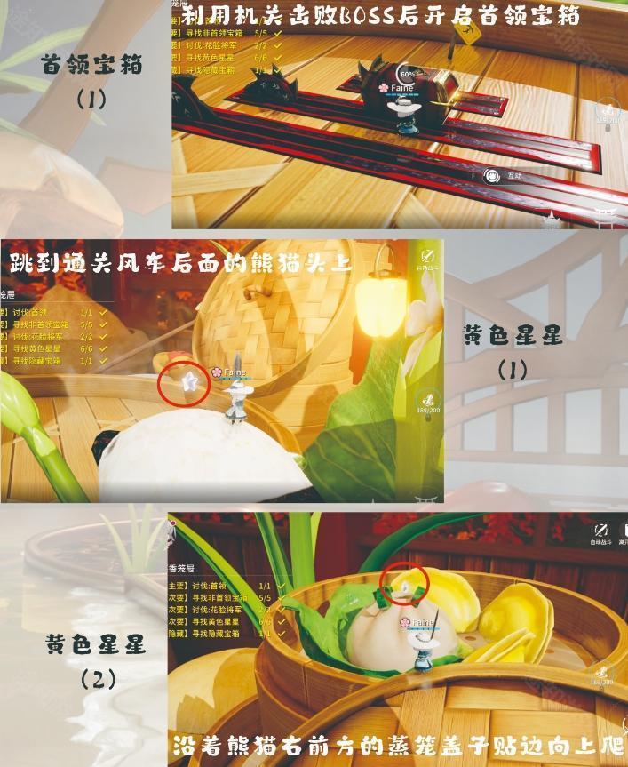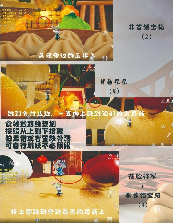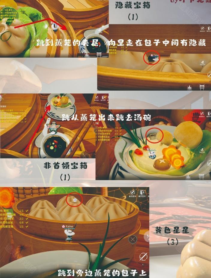 5、跳从蒸笼出来跳去汤碗,开启非首领宝箱(1/5),然后再跳到旁边蒸笼的包子上,拿到第三颗星星(3/6)