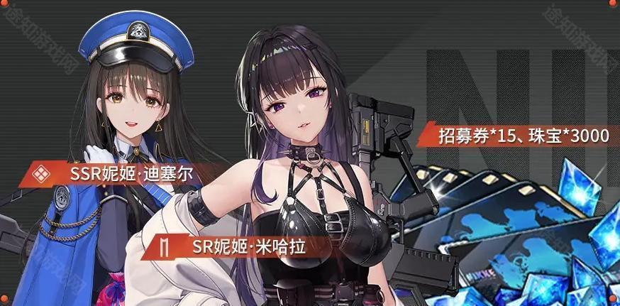 所有玩家注册并登陆游戏即可通过邮件获得::SSR妮姬·迪塞尔*1、SR妮姬·米哈拉*1、招募券*15、珠宝*3000