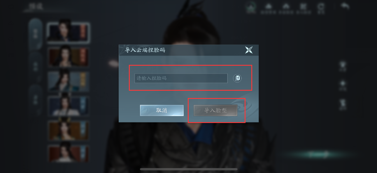 1、点击选择门派体型——成男,并点击右上角导入脸型