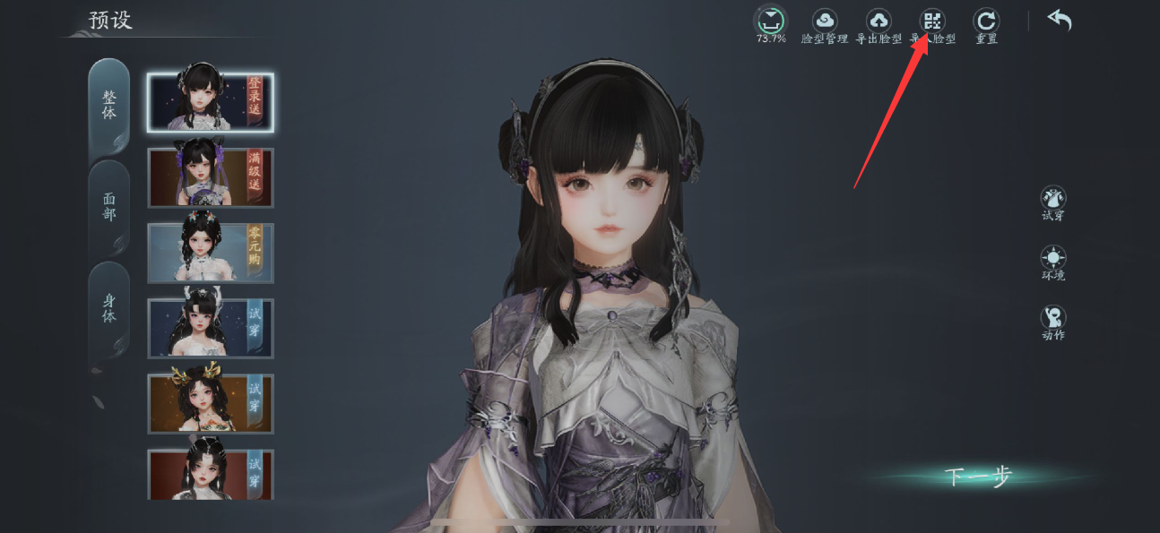 1、点击选择门派体型——萝莉,并点击右上角导入脸型