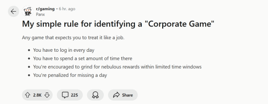 在游戏世界里,有一个微妙的界限,它将享受与义务分隔开来。最近,Reddit论坛上有网友提出了一个简单的规则,用来识别他们所称的“企业游戏”。