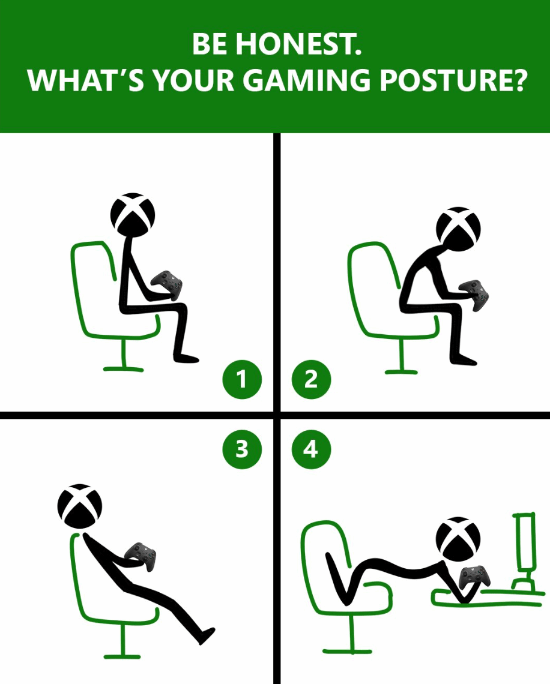 你平时用手柄玩游戏时,习惯用什么姿势?是姿势端正的“正坐”,还是舒舒服服躺在椅子上?或是直接接个大屏幕,趴在床上玩?今日,Xbox官方推特发文征集,“你在玩游戏时一般会用什么姿势?”
