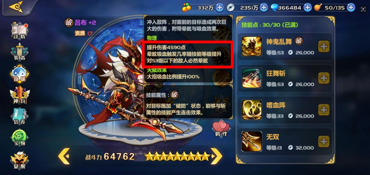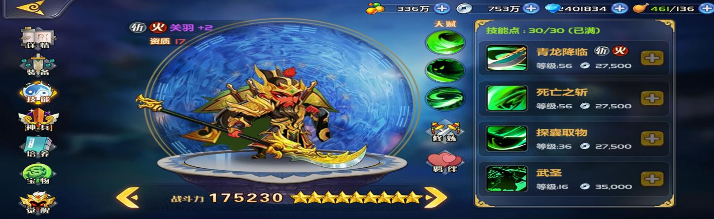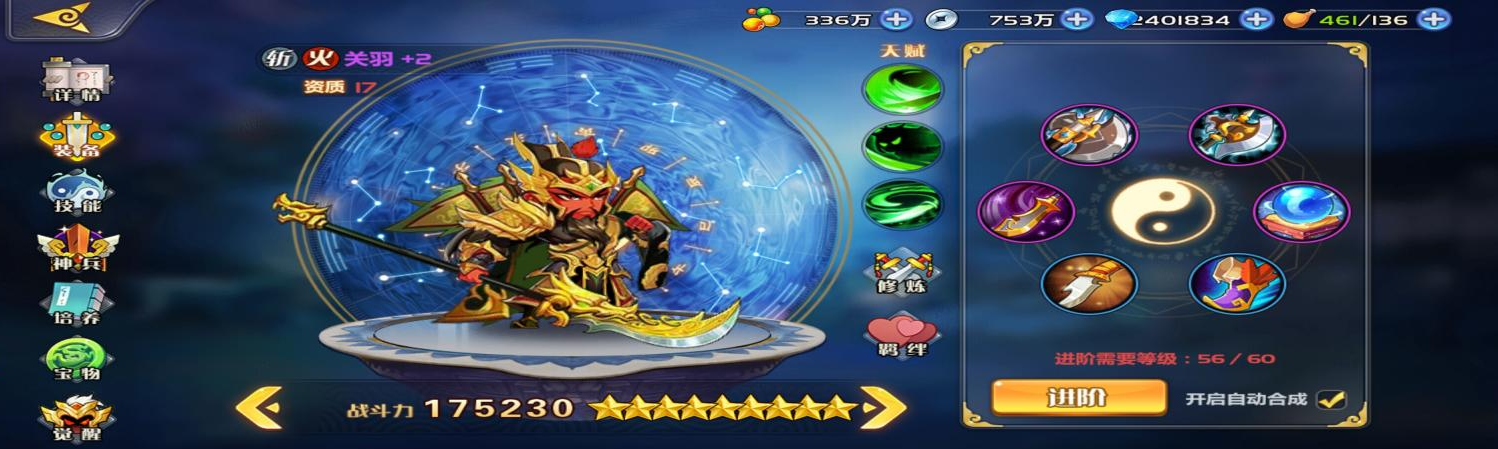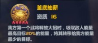 神兵词条是获取初始能量的主要系统,初始能量越高,释放大招越快,像关羽大招的全队免控,孙策大招的开局控制聚怪,武田信玄大招的开局增益狂暴等对初始能量的要求都比较高,先培养这些大招优先级比较高的武将