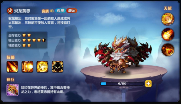 炎龙黄忠:拥有火属性大范围多次爆炸伤害,7星还会增加一倍的爆炸范围,并且有80%的概率不消耗旋风状态,小技能穿甲弹破甲,闪光弹致盲,致盲期间所有攻击都会被闪避,技能机制完美适配孙策,攻击模组很差,pve伤害略高于哪吒,pvp不如哪吒,考虑到培养成本,黄忠和郭嘉只推荐养其中一个