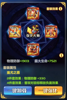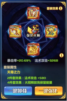 宝物以红色套装举例,天尊,轩辕这种属于输出类型的给c穿的,天尊是+法术,轩辕是+物理,其他三个词条都是暴击爆伤伤害加成,随便点开一个武将技能,可以看到是法术伤害还是物理伤害,例如哪吒是法术就穿天尊,关羽是物理就穿轩辕,蚩尤是给前排抗伤或辅助角色穿的,不需要他打多高的输出,例如孙策,吕蒙等都可以穿蚩尤,套装建议优先第一队5个人先各拿一套以后再升星,升星可以增加套装效果