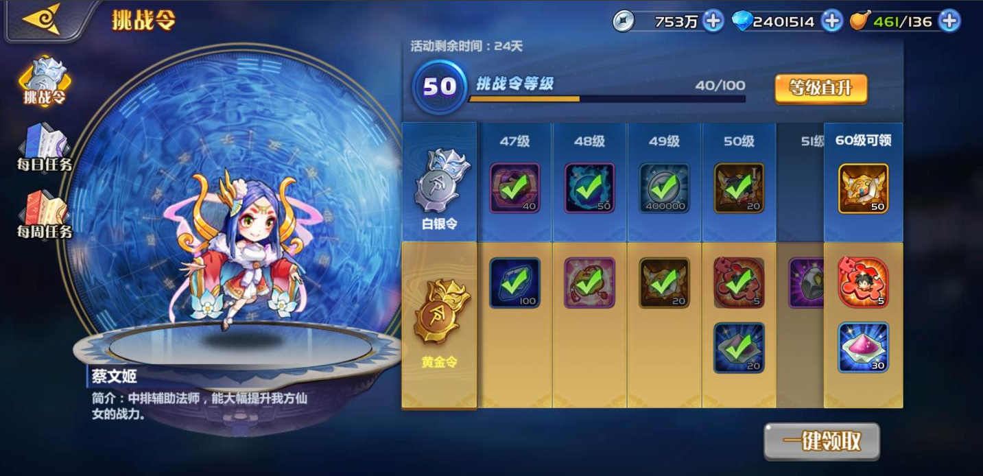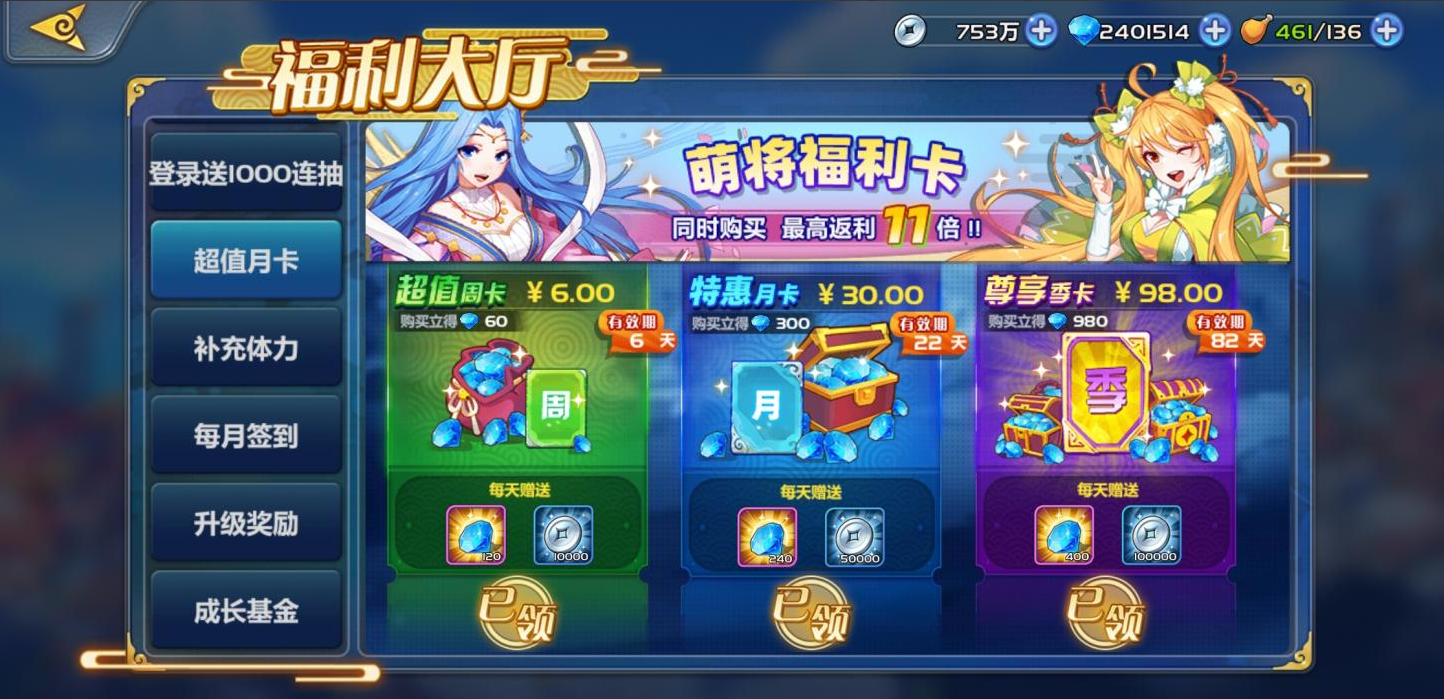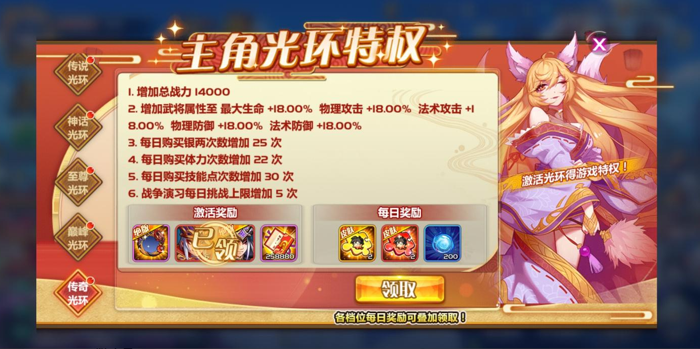 这个是必拿的游戏内性价比最高的,百分比提升所有武将的基础属性,每日奖励有万能碎片,宝石,体力等大量培养资源,激活奖励有吕布,猴子,司马懿三张资质17的武将以及对应皮肤,前期开荒就可以用这三个再搭两个资质16的武将