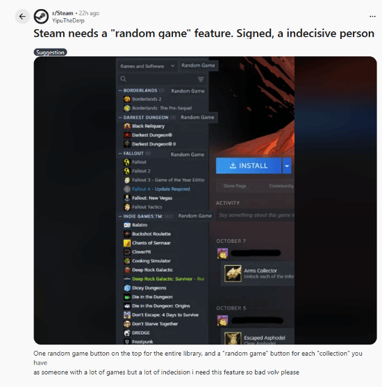 针对这一问题,Reddit用户YipuTheDerp近期发起倡议,呼吁Valve为Steam添加“随机游戏”功能,称自己的“选择困难症”是核心原因。他还进一步提出,该功能可采用“基于游戏集的随机机制”,允许用户将随机范围限定在自定义游戏收藏夹内,从而按需缩小选择范围。这条帖子发布15小时内便获得超过8600次点赞及数百条评论,并于11月29日登上Steam社区首页顶端,可见相当一部分玩家群体对此表示支持。部分用户认同发起者的观点,称在不确定接下来玩什么时,随机功能能帮助他们“攻克”日益庞大的Steam游戏库存;另有用户表示,即便仅出于新鲜感也期待该功能——他们认为,发掘一款意外合心意的游戏本身就能成为一种“元游戏”体验,类似收集Steam集换式卡牌的乐趣。