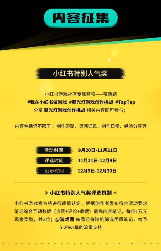 在这次和聚光灯GameJam的独家合作中,参与小红书投稿官方会随机筛选优质笔记并额外给予参赛作品5-20w/每篇的流量支持。并在其特有的阶梯式算法推荐中不断累积曝光量,进入下一个流量池,展现在上亿用户面前。