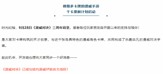 今天,由网易与漫威合作开发的3D卡牌竞技游戏《漫威对决》官方爆料:经过双方协商,《漫威对决》已续约,将进行长期合作,同时还公布了后续的开发规划,将至少更新至1000张卡牌,并且打出了“零氪全图鉴”“累送200卡包”的口号。这似乎是“漫威继续压宝国内市场”的一种信号。