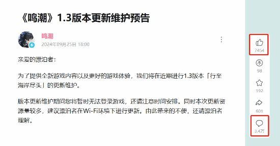 截至目前,《鸣潮》官方B站公告的评论数已经达到3.4万,点赞仅7454.